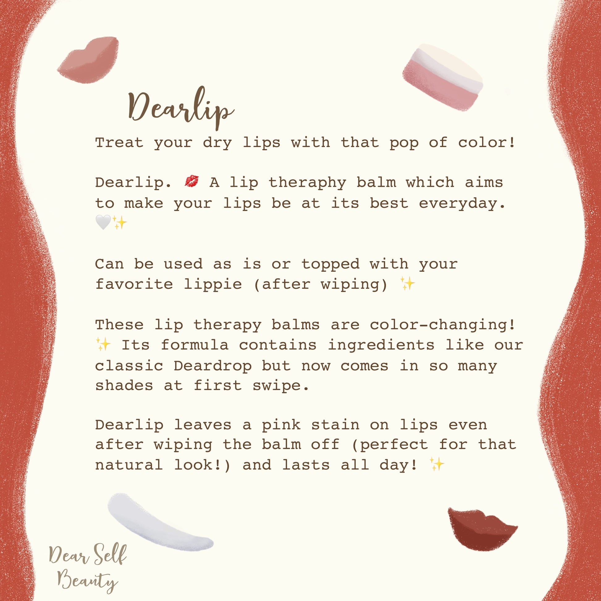 These lip therapy balms are color-changing! β¨ Its formula contains ingredients like our classic Deardrop but now comes in so many shades at first swipe. β€οΈ Dearlip leaves a pink stain on lips even after wiping the balm off (perfect for that natural look!) and lasts all day!!! πβ¨